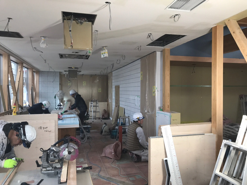 市内のファーストフードの内装改装中 日曜日返上で皆さんがんばってくれてます たのもしいメンバーです